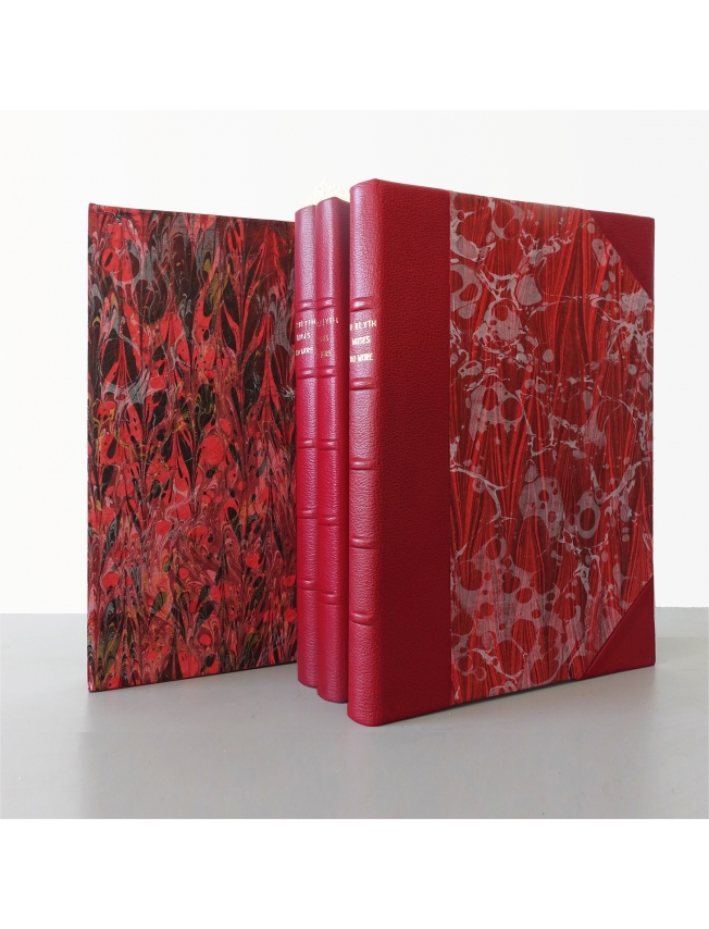 Half-leather binding in Venetian Crimson Shagreen Leather on five raised bands.