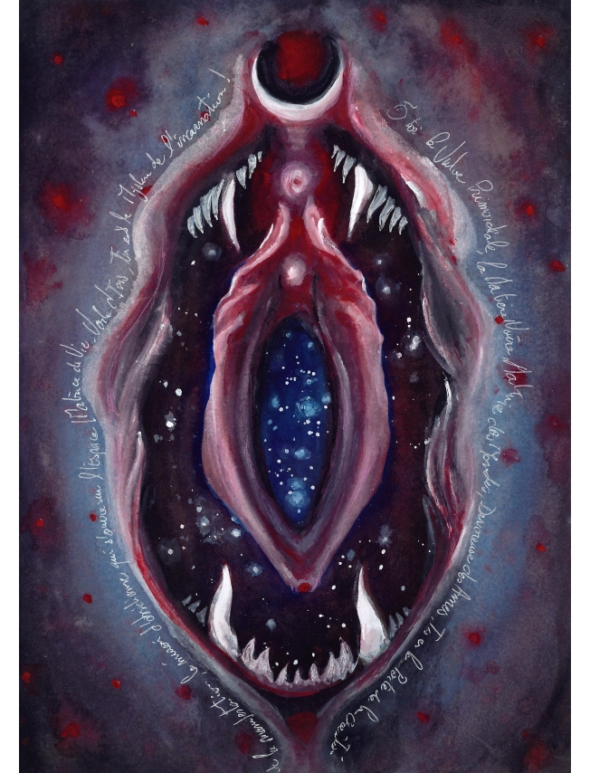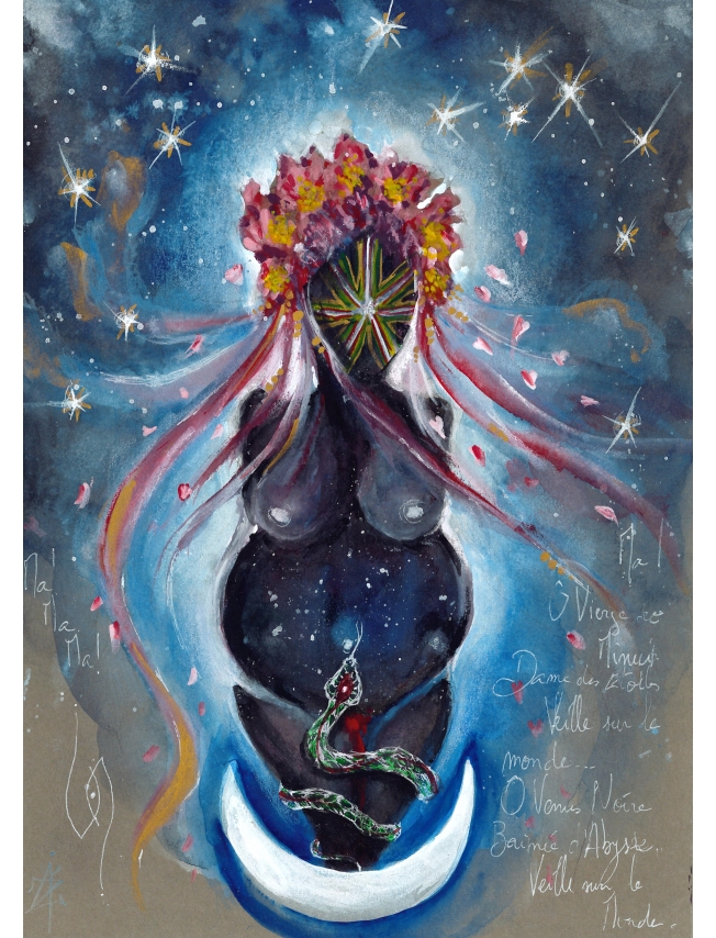 She is faceless, carrying the cosmos in her womb, crowned with spring flowers, surrounded by the Serpent on the lunar bark. She is the Great Mother, cosmic and chthonian at the same time, without name or face, and who nevertheless can bear them all. She is neither a pagan deity nor a divine form of current religions. Instead, these icons have been proposed as a mystical and archetypal vision draining several currents of cultural/cultic, temporal, spiritual and folkloric substrate. She is the Great White Goddess (1734 and Cochrane), Our Lady of Midnight, Our Lady of the Fallen Stars (the Watchers), Our Lady of the Powers of the Night.