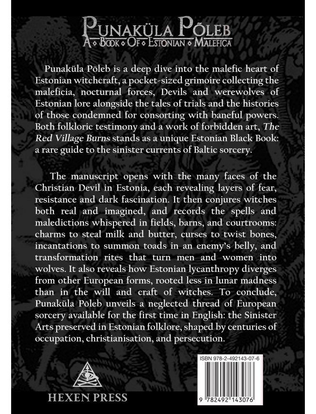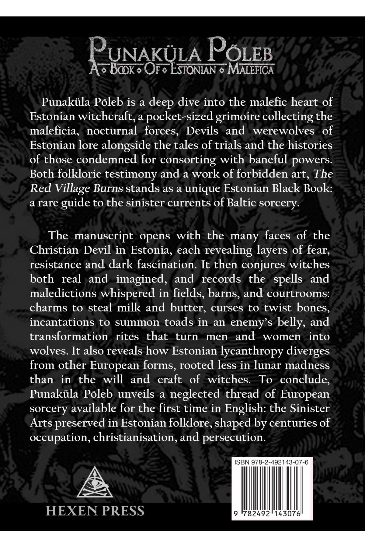 The manuscript opens with the many faces of the Christian Devil in Estonia, each revealing layers of fear, resistance and dark fascination. It then conjures witches both real and imagined, and records the spells and maledictions whispered in fields, barns, and courtrooms: charms to steal milk and butter, curses to twist bones, incantations to summon toads in an enemy’s belly, and transformation rites that turn men and women into wolves. It also reveals how Estonian lycanthropy diverges from other European forms, rooted less in lunar madness than in the will and craft of witches. To conclude, Punaküla Põleb unveils a neglected thread of European sorcery available for the first time in English: the Sinister Arts preserved in Estonian folklore, shaped by centuries of occupation, christianisation, and persecution.